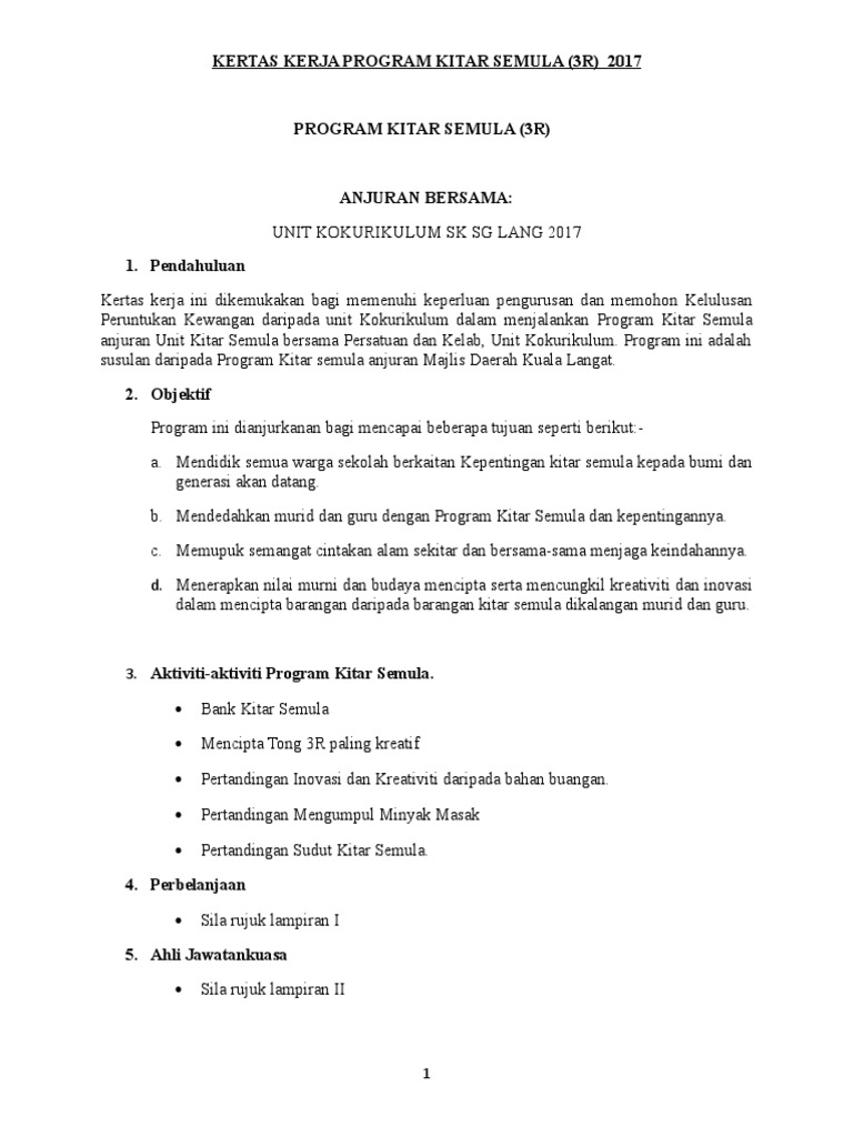 Doc Contoh Kertas Kerja All Huurahh Bryan Godon Academia Edu. Kertas Kerja Program Kitar Semula Peringkat Sekolah 2012 SK PANDAN PERDANA Ampang Selangor. Kertas Kerja Program Kitar Semula Peringkat Sekolah 2011 SMK DATO HAMZAH Pelabuhan Klang.